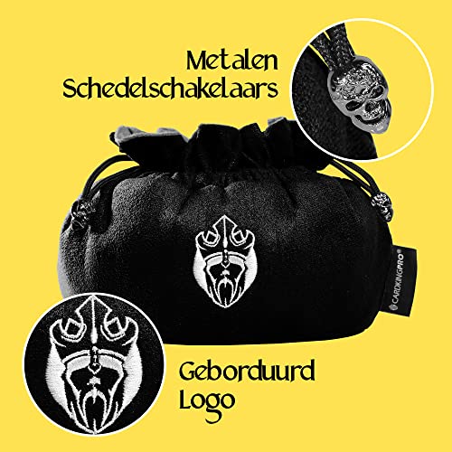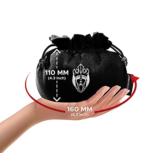 🃏 CAPACITEIT – deze tas kan maar liefst méér dan 150 dobbelstenen bevatten en sluit veilig met behulp van de ingebouwde trekkoorden met knopen in de vorm van schedels. Als je een kleinere tas nodig hebt, bekijk dan eens onze andere ZELFSTAANDE dobbelsteentassen